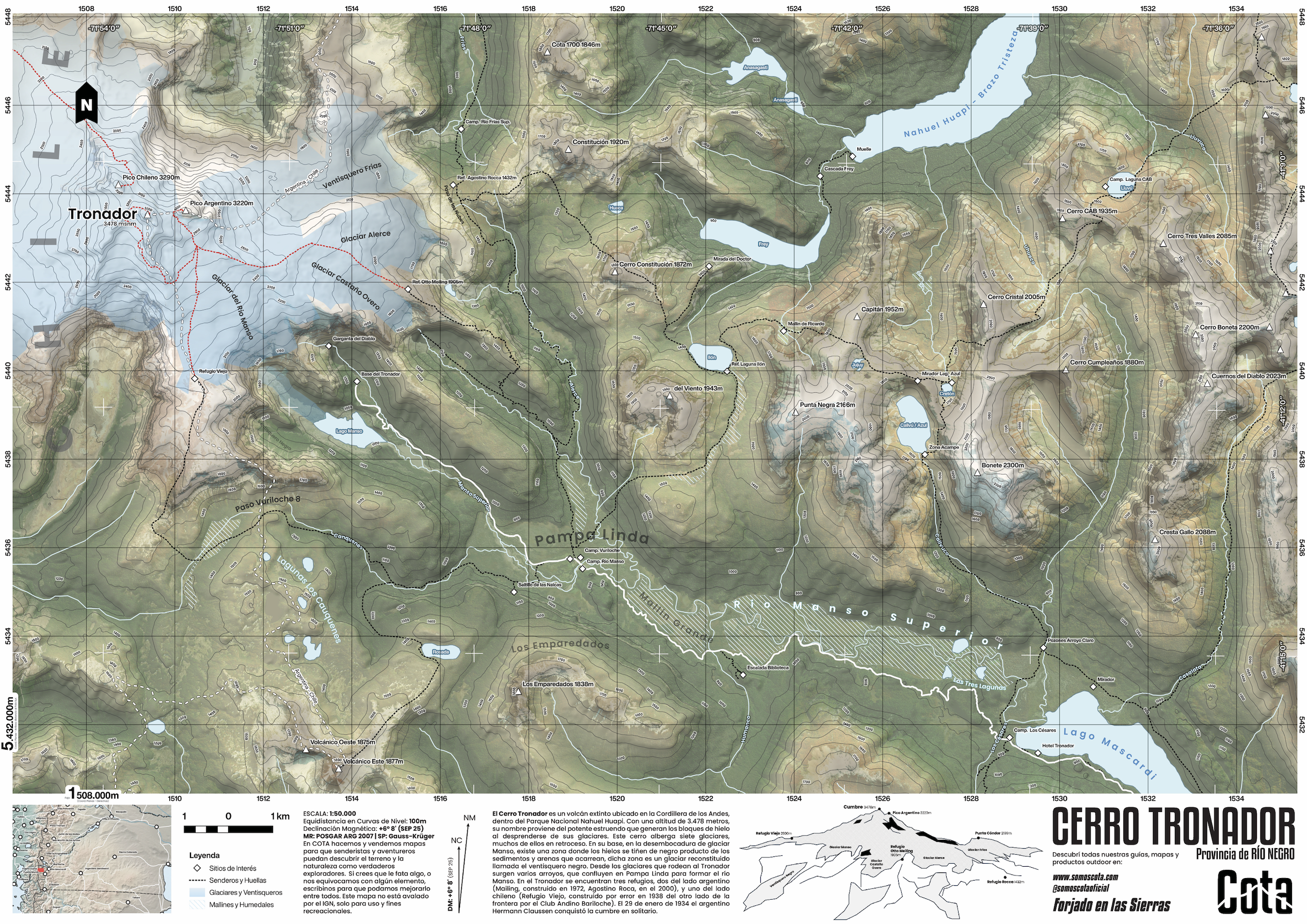 Muestra el sector de Pampa Linda, accesos y senderos de acceso al cerro Tronador, así como sus famosos refugios e increíbles glaciares.