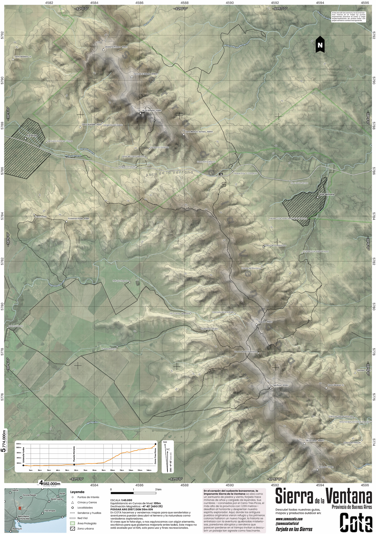 Muestra la región más popular de ascensos en las sierras, incluyendo el ascenso al Cerro Ventana, así como el del Cerro Tres Picos desde Estancia Funke.